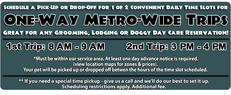 We offer pick-up and drop off service for dogs or cats Lodging, Grooming or Doggy Day Care.